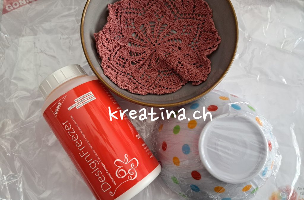 Dafür brauchst du den DesignFreezer, den du im Verhältnis 1:1 mit Wasser mischst. Ausserdem benötigst du eine Schüssel sowie eine zweite Schüssel, die genau zur Grösse deines Untersetzers passt. Diese kleidest du am besten mit Frischhaltefolie aus.