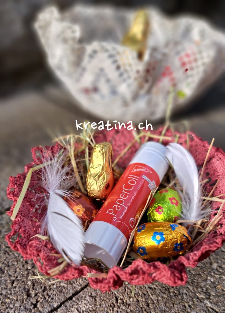 Das gehäkelte Nest kannst du natürlich mit Schokoeiern und einem Hasen befüllen, aber auch wunderbar mit GONIS-Produkten. Zum Beispiel mit PaperColl, Mini GoniDecor oder DecoPointer. Auch EasyStamp passt perfekt dazu. Je nach Grösse des Nests finden natürlich auch Waxarell, Patscholino, GlasDecor, ein Kleberset und vieles mehr darin Platz.