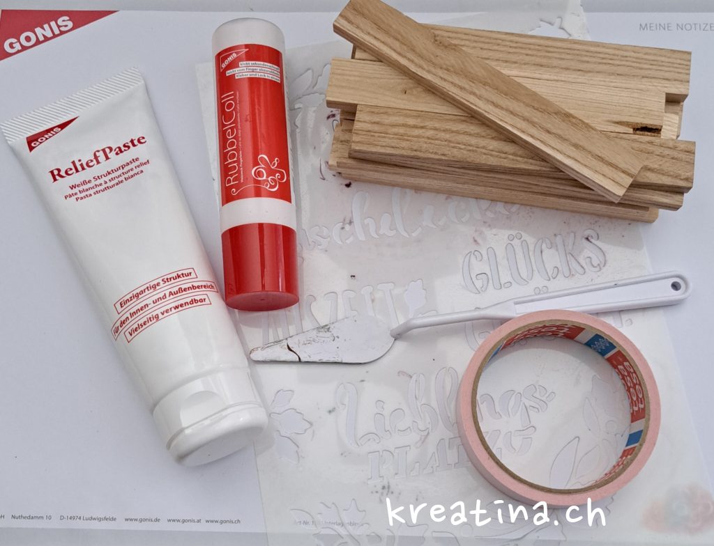 Was du dafür brauchst: 16 Holzsticks, den RubbelColl, deine Wunsch-Flexschablone, Reliefpaste und einen Spachtel. Für den letzten Schliff kannst du nach Belieben noch etwas Juteschnur brauchen.