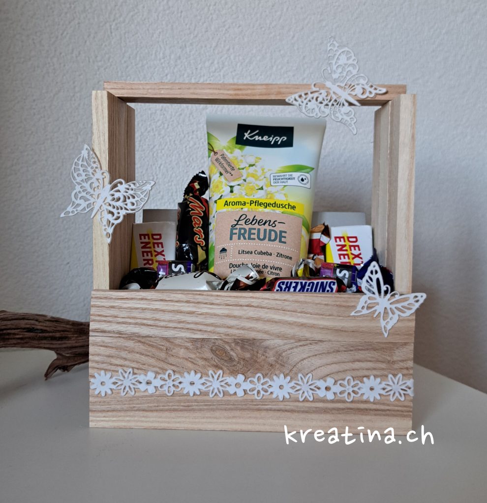 Jetzt kannst du das kleine Holzkistchen mit deiner Kleinigkeit befüllen und schon ist dein Geschenk bereit zum Verschenken,