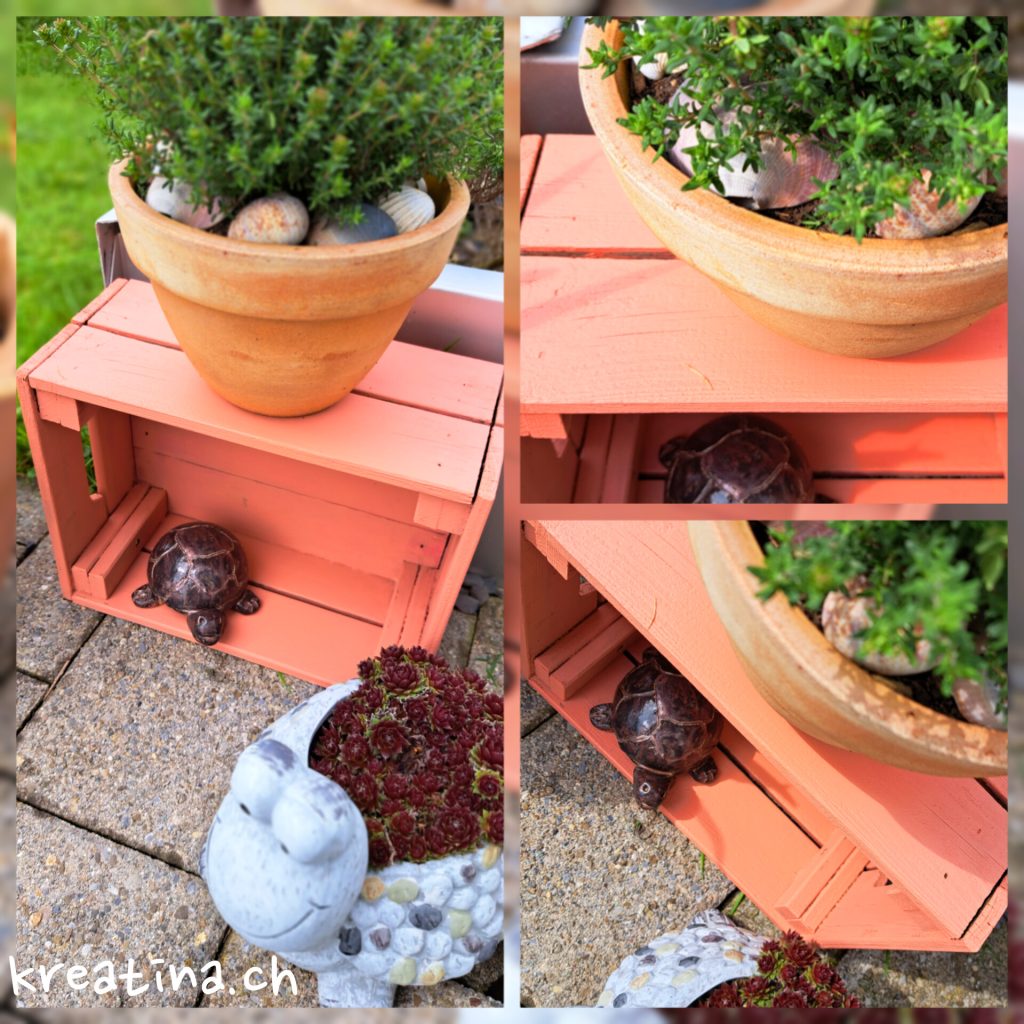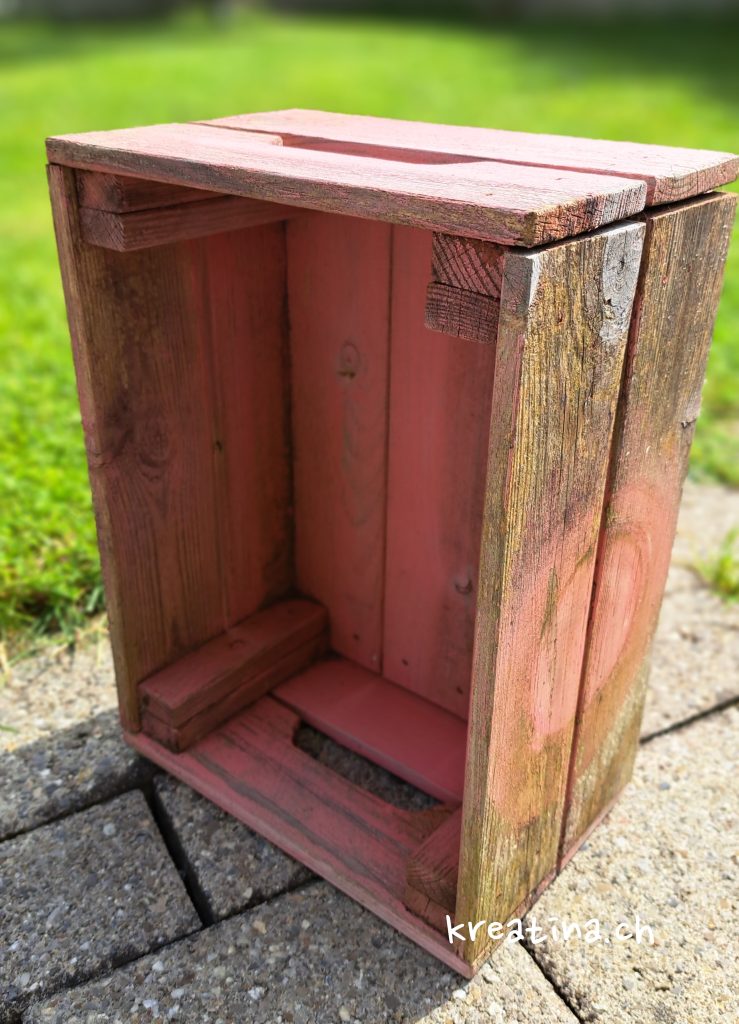 Nun ist die Holzkiste in einem neuen Look und macht Freude. Natürlich könntest du auch ein Farbverlauf mit 2 Farben machen, hier gibt es keine kreative Grenzen. Einfach ausprobieren, staunen und den Anblick geniessen.