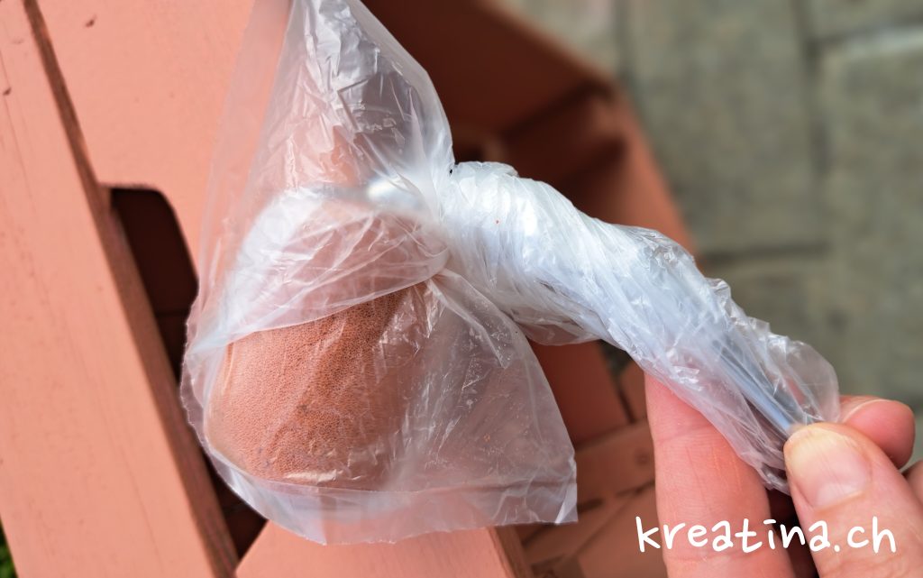 Dein Farbroller darf eine kurze Pause machen, so gib ihn in ein Raschelsäckli und zwirble es möglichst kompakt zusammen. Denk daran, im Farbroller hat es noch viel Farbe, die du beim nächsten Anstrich gut weiter einrollen kannst. Wenn dein Objekt fertiggestellt ist, reinigst du den Roller gut mit Wasser.