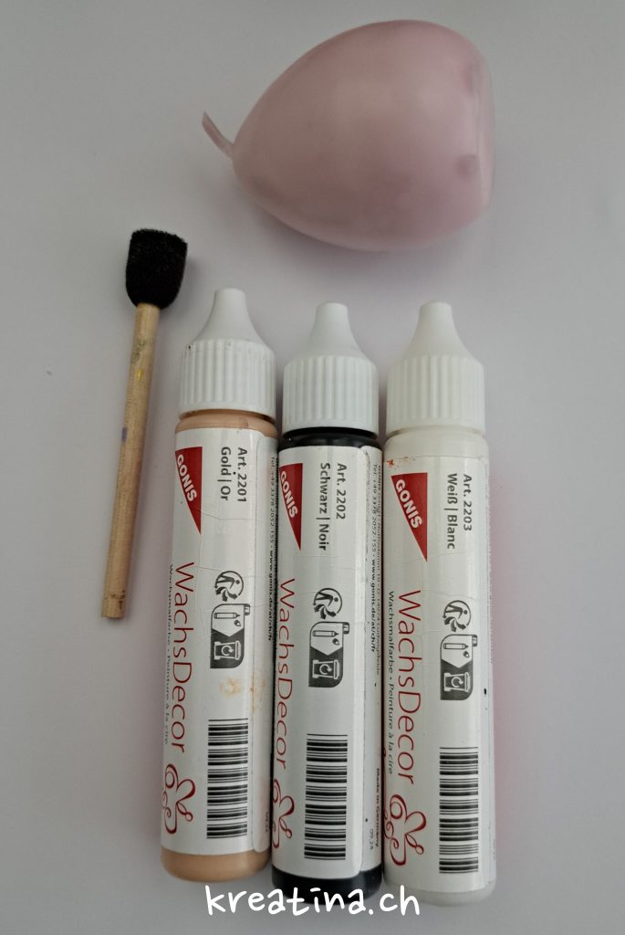 Dafür brauchst du eine Eierkerze – normale Kerzen funktionieren natürlich auch 🙂 –, das WachsDecor Set, einen kleinen Tupfschwamm und ein Tuch, damit die Kerze staub- und fettfrei ist.