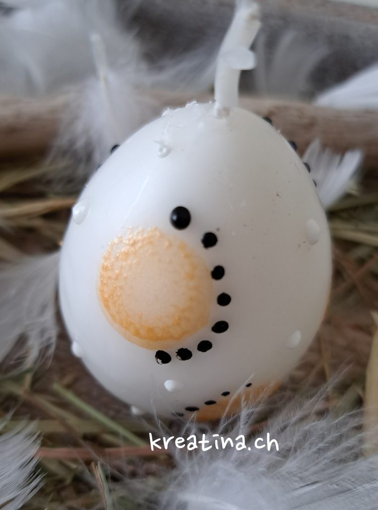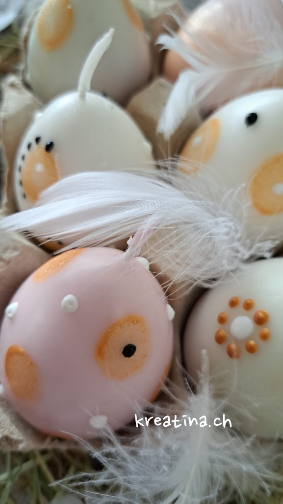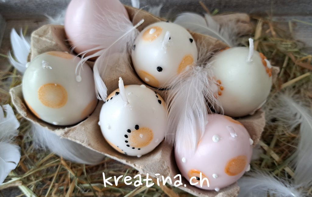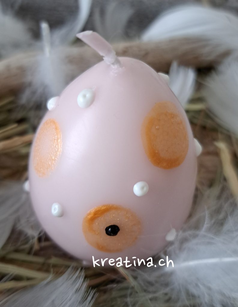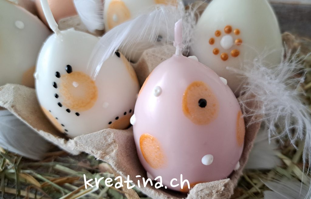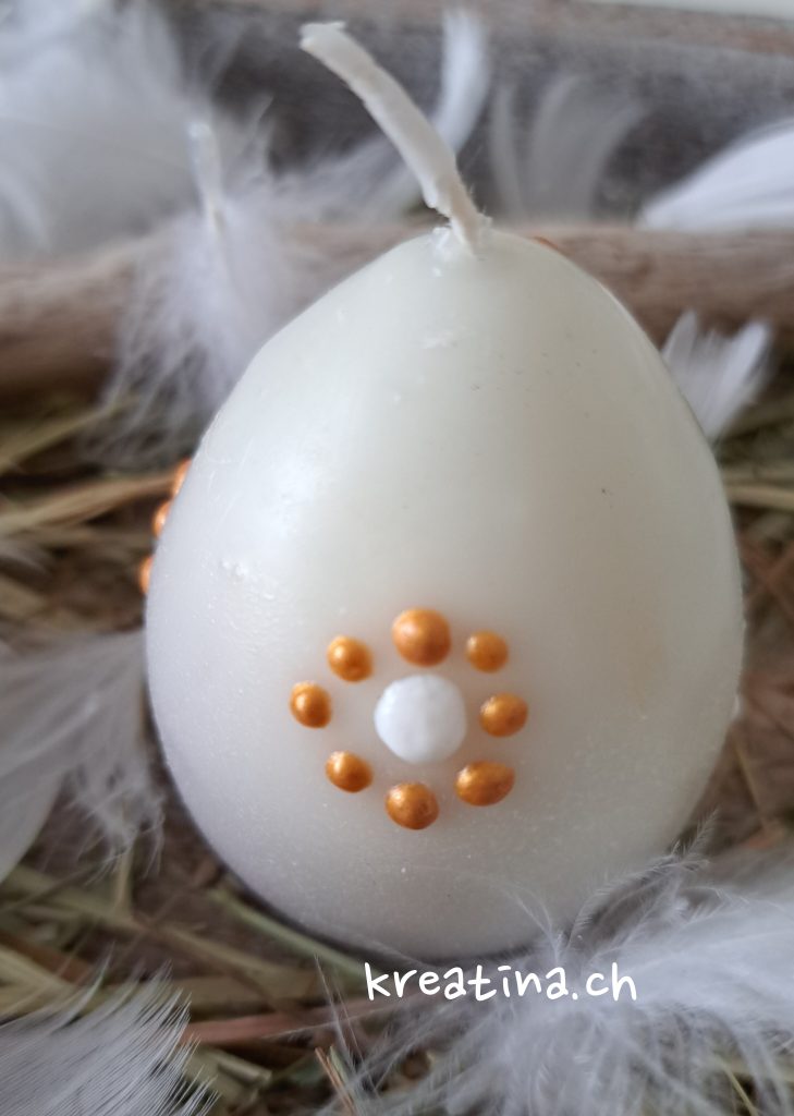 Die Eierkerze kannst du für die Tischdekoration auf eine Holzscheibe stellen oder in ein Glas mit etwas Ziersteinen platzieren. So sorgt sie für stimmungsvolles Licht auf deinem Ostertisch.
