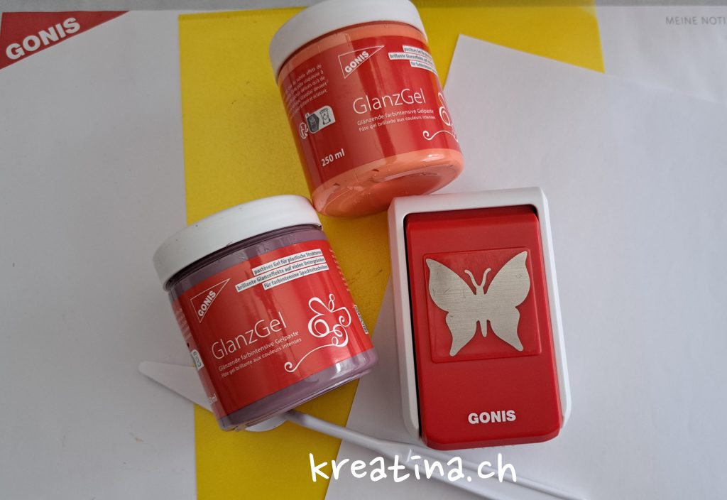 Letzte Woche habe ich euch das GlanzGel vorgestellt. Es ist unglaublich vielseitig einsetzbar – ob zum Spachteln, zum Gestalten von Bildern auf Leinwand, zum Stempeln oder auch zum Schablonieren. Heute möchte ich euch zeigen, wie ihr mit dem GlanzGel wunderschöne Schmetterlinge gestalten könnt.