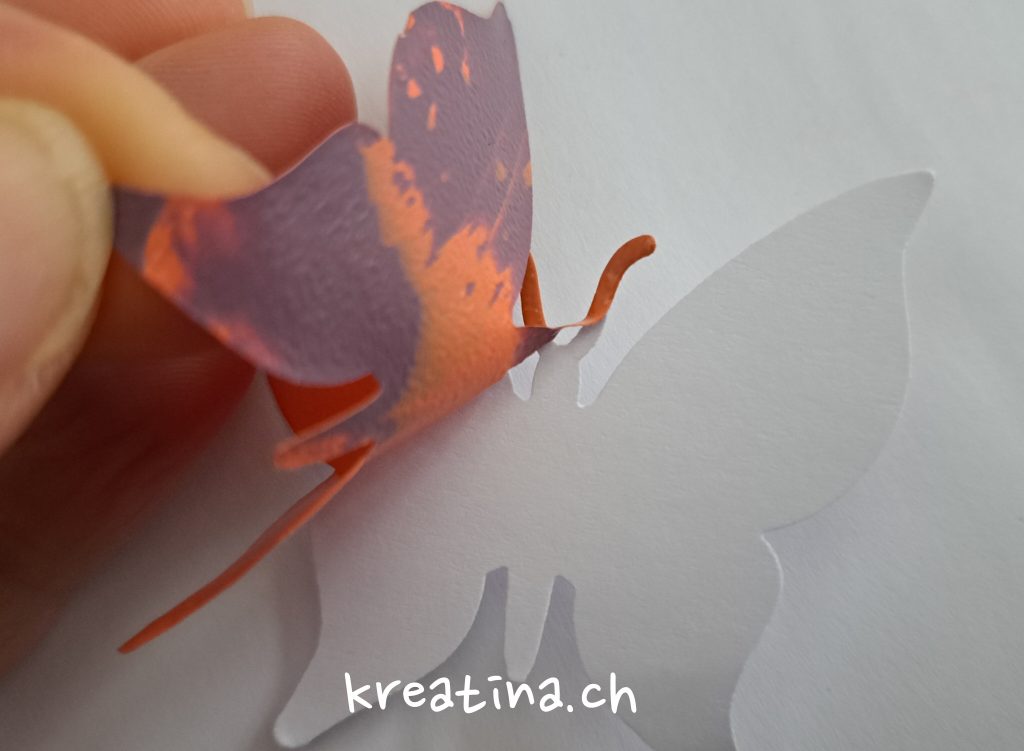 Nun legst du die GlanzGel-Matte auf ein Blatt Kopierpapier, damit nichts zusammenklebt, und stanzt daraus die Schmetterlinge aus. Anschliessend ziehst du das Papier vorsichtig ab und klebst deinen GlanzGel Schmetterling auf das Windlicht.