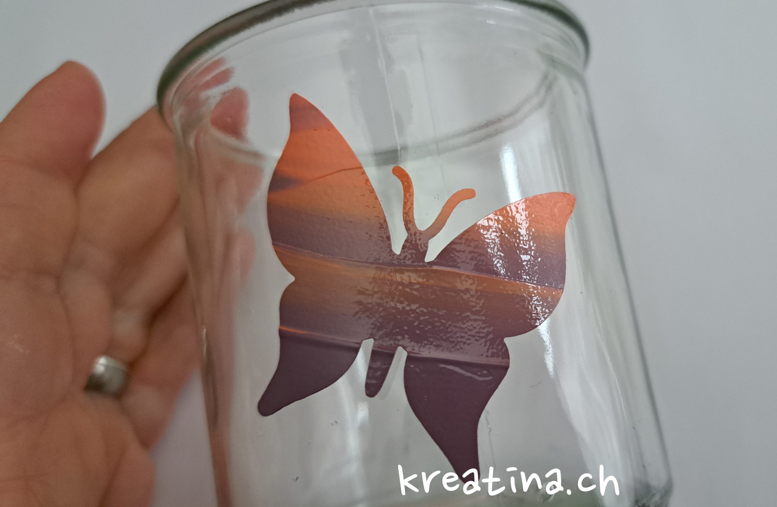 Das Verrückte daran: Wenn du irgendwann keine Lust mehr auf Schmetterlinge hast, kannst du sie ganz problemlos wieder entfernen und dein Windlicht neu gestalten.