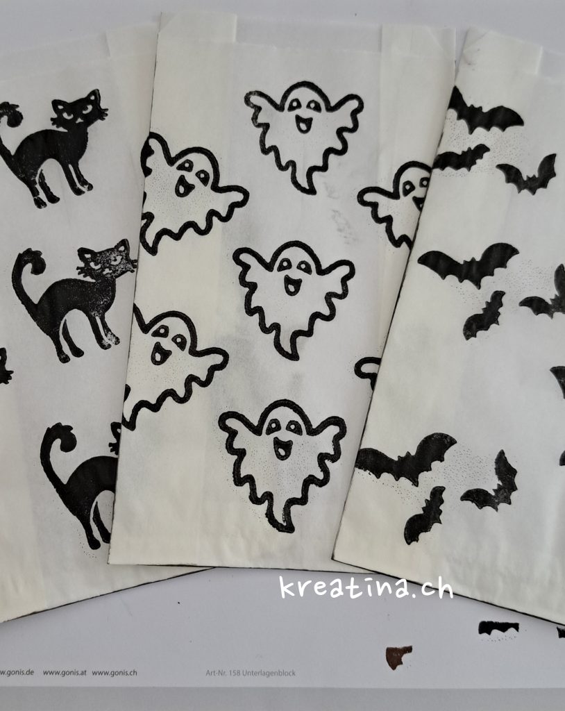Ich dachte mir, wie cool wäre es eigentlich, wenn die Kids direkt an der Tür eine kleine Süssigkeitentüte bekommen? Falls du selbst Kinder hast, ist das eine super Beschäftigung für sie – und auch für dich ist es im Handumdrehen gemacht. Dazu brauchst du das EasyStamp Set Halloween, OutdoorDecor Schwarz, natürlich geht es auch mit GoniDecor Schwarz und Sandwichtüten.