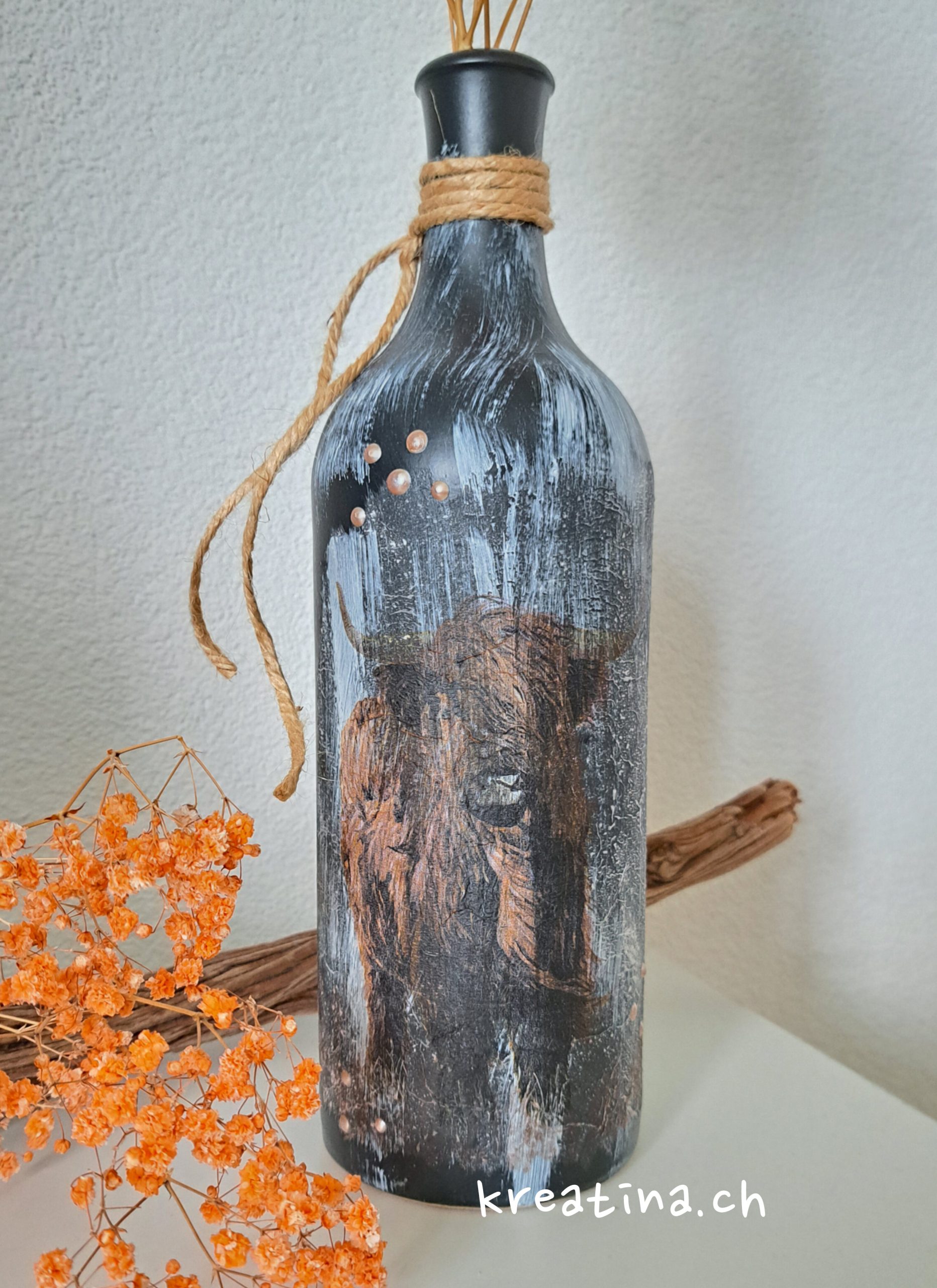 In diesem Herbst steht das Hochlandrind im Mittelpunkt. Da ich noch eine schwarze Steinzeugflasche auf der Seite hatte, kam mir die Idee, diese nun passend für die herbstliche Saison zu gestalten.