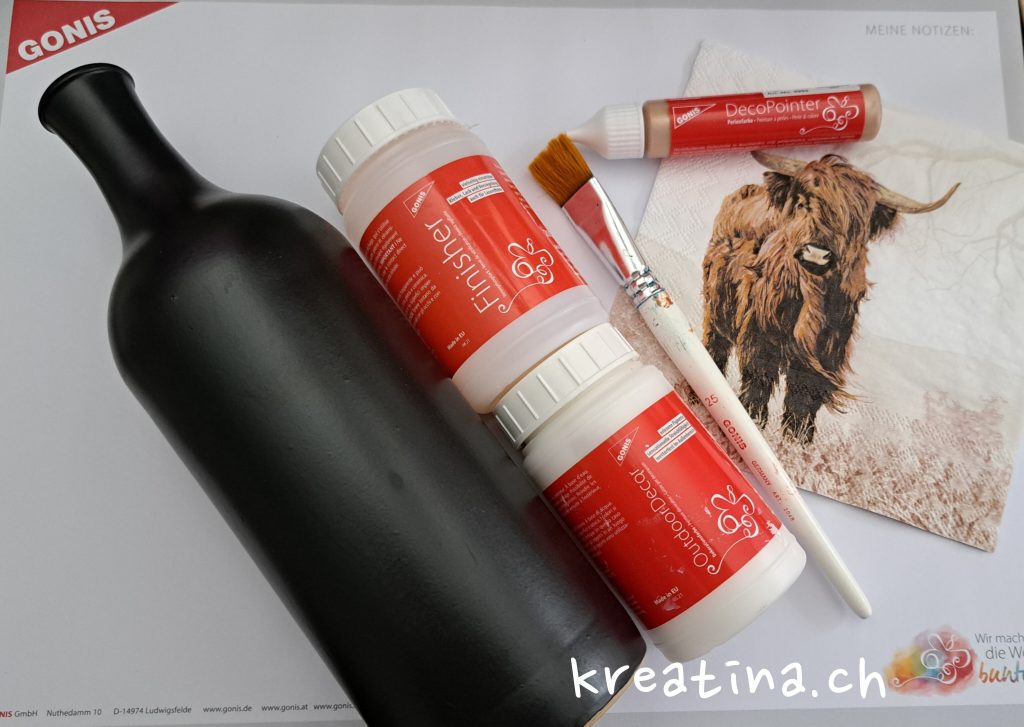 Für dieses herbstliche Projekt brauchst du die schwarze Steinzeugflasche, OutdoorDecor in Weiss, den Finisher, den DecoPointer, Pinsel sowie die Serviette mit Hochlandrind-Motiv. Wer mag, kann das Ganze zusätzlich mit etwas Juteschnur abrunden.