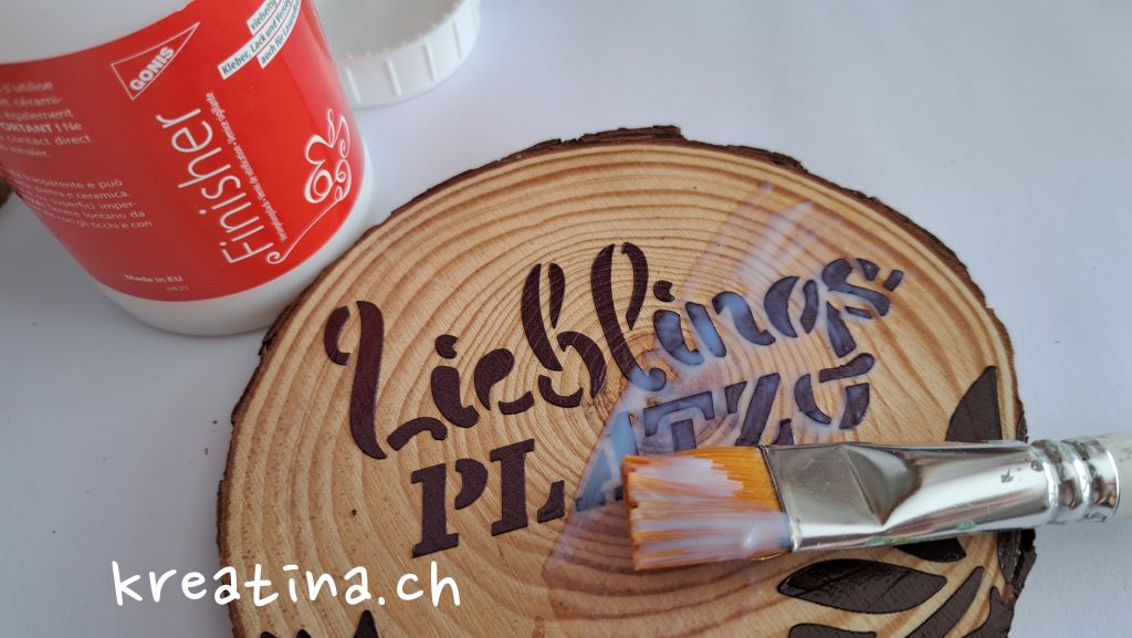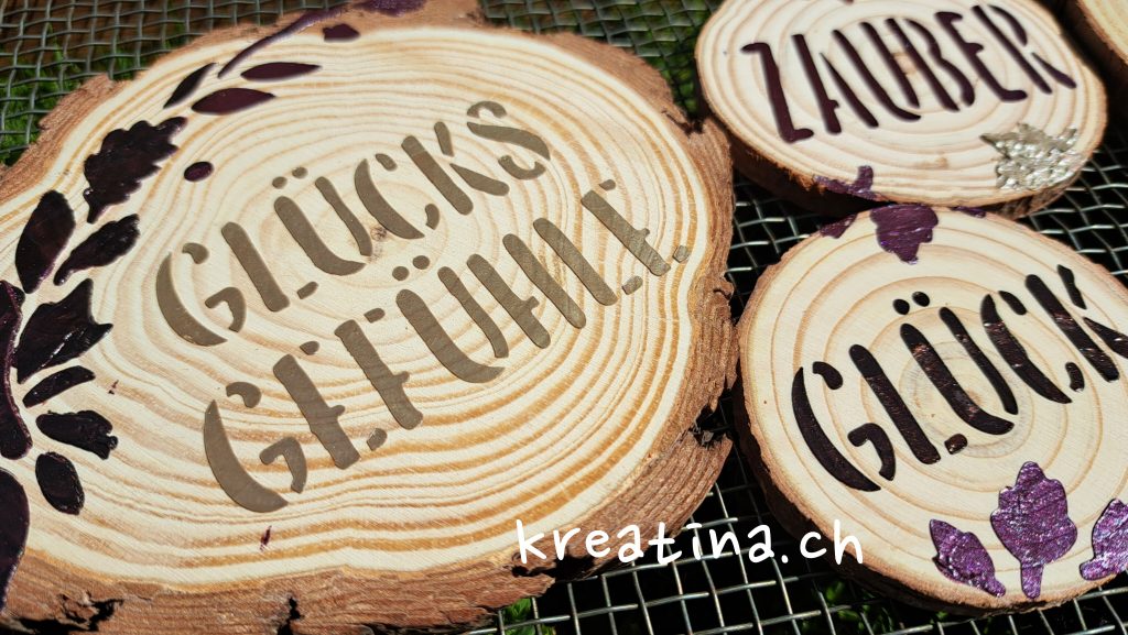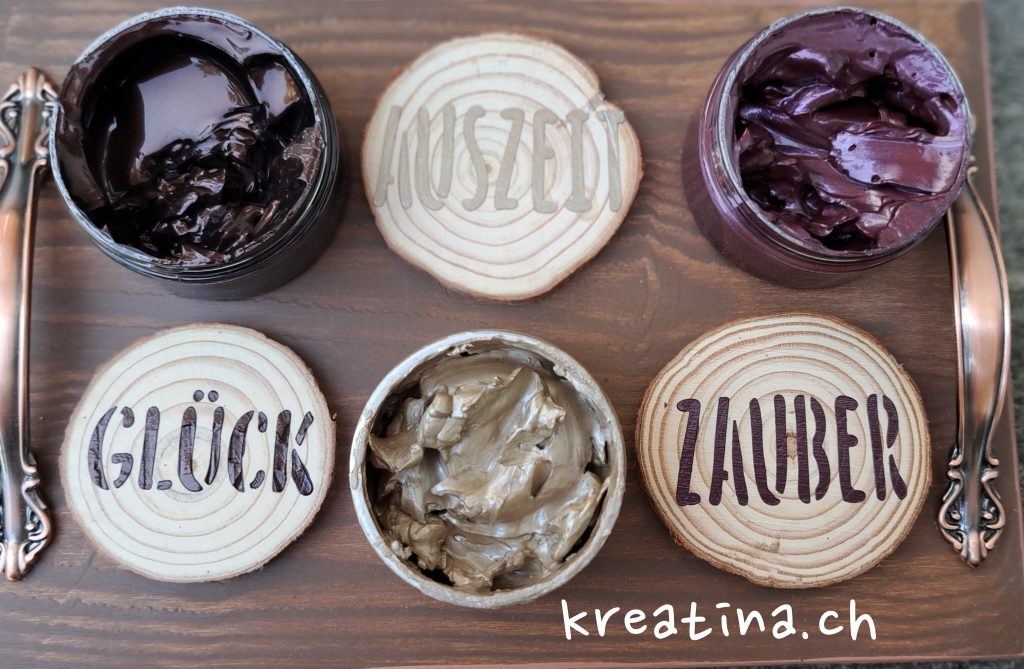 Wie bereits oben erwähnt, rührst du die GlamourCreme zunächst gut durch. Danach legst du die Schablone auf die Holzscheibe und trägst die Creme mit Hilfe des Spachtels auf.