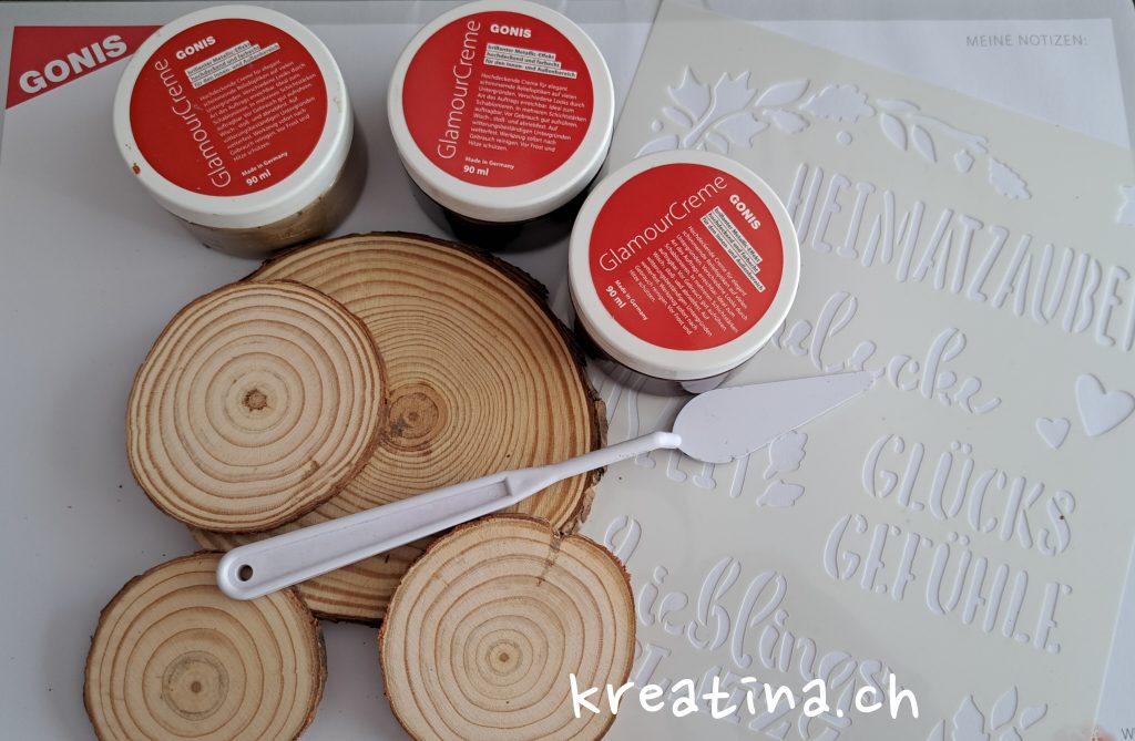 Für meinen GlamourCreme-Vorschlag benötigst du Holzscheiben in verschiedenen Grössen, die Herbstgeflüster Flexschablone, natürlich die GlamourCreme sowie einen Spachtel.