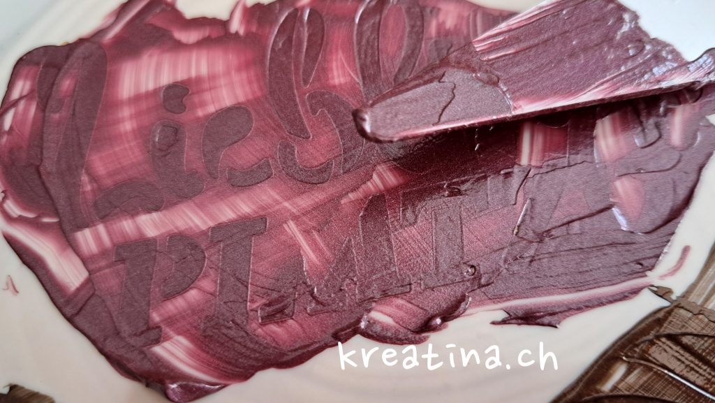 Wenn es passt, kannst du gleich im nächsten Schritt auch eine andere GlamourCreme Farbe verwenden und damit ein Wort schablonieren. Anschliessend die Schablone entfernen. Verwendete Werkzeuge/ Schablone sollten sofort nach Gebrauch gründlich mit Wasser gereinigt werden.