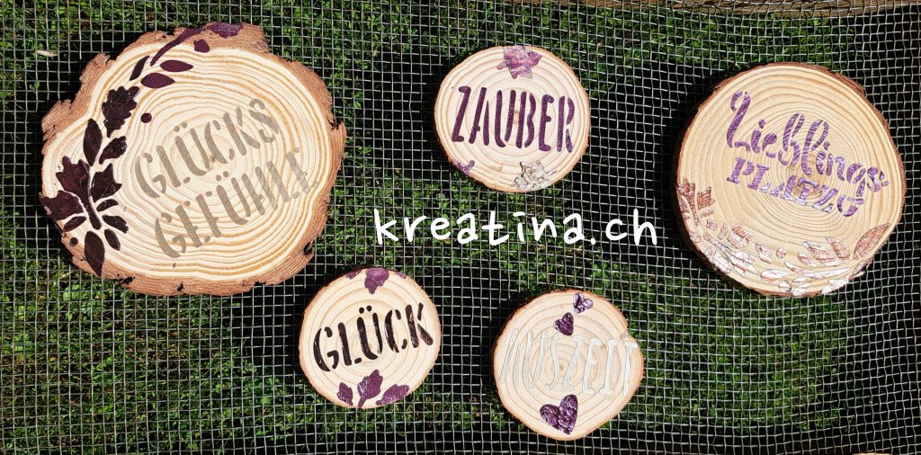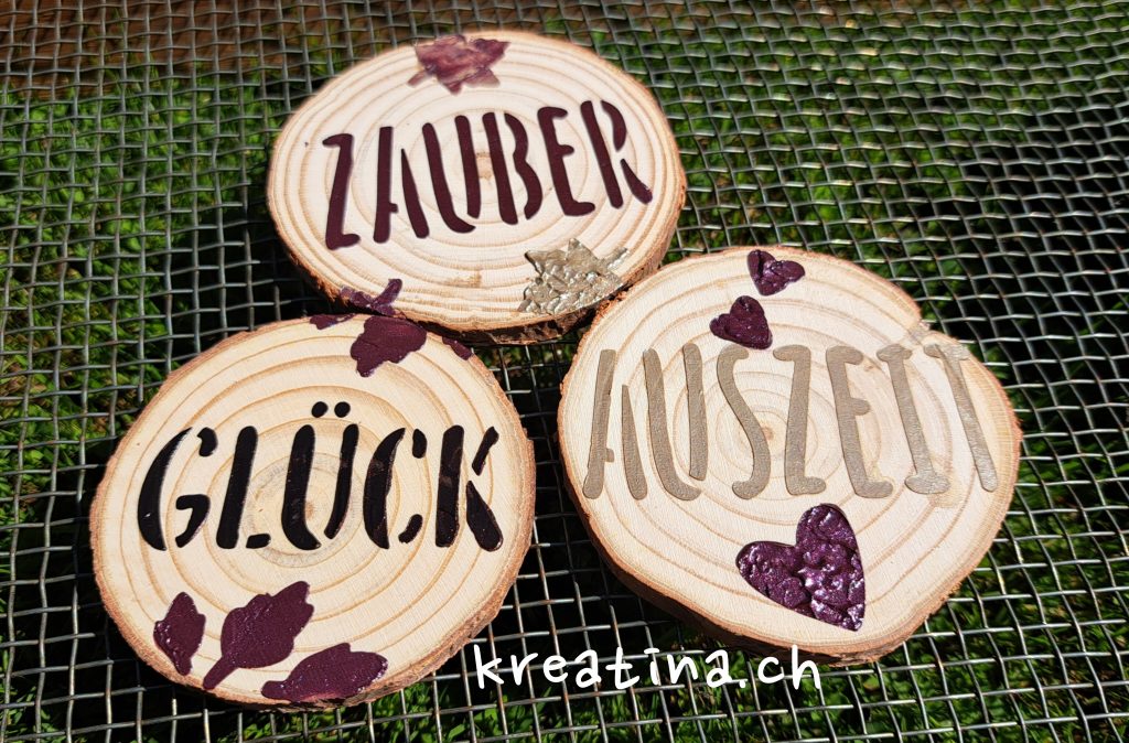 So entstehen wunderschöne, individuelle Holzscheiben in den GlamourCreme Farben Zartbitter, Aubergine und Caramel. Sie lassen sich herrlich im Freien dekorieren und stimmen uns perfekt auf den Herbst ein.