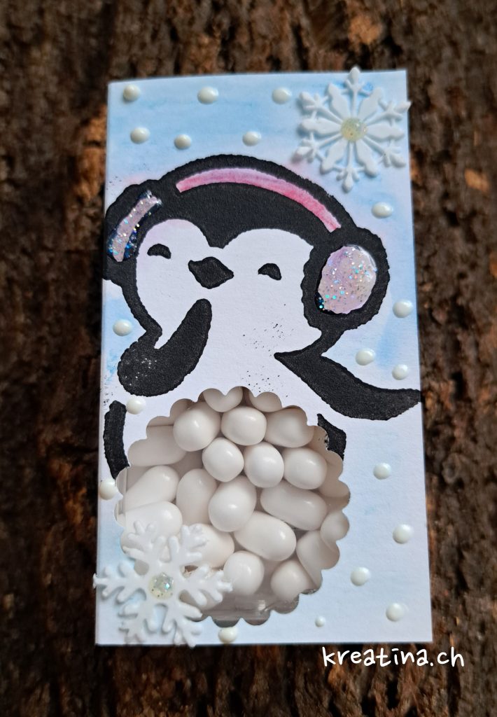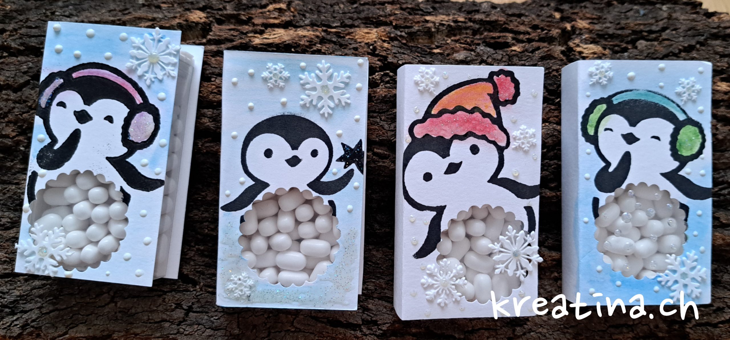 Ich habe mich restlos in die entzückenden EasyStamp Putzige Pinguine verliebt. Diese kleinen Kreaturen heissen Phil, Pepa und Püppi und sind nicht zum kaufen, sondern können als Gastgeberin oder im Kundengeschenksortiment geschenkt werden. In unserem Winterheft kannst du die drei Pinguine auch bestaunen. Ihre bezaubernde Niedlichkeit fasziniert mich zutiefst, und sie bieten unendliche Möglichkeiten, um besondere Geschenke zu kreieren. Heute möchte ich euch zeigen, wie man TicTac Böxli zu einem süssen Pinguine-Geschenk verwandeln kann.